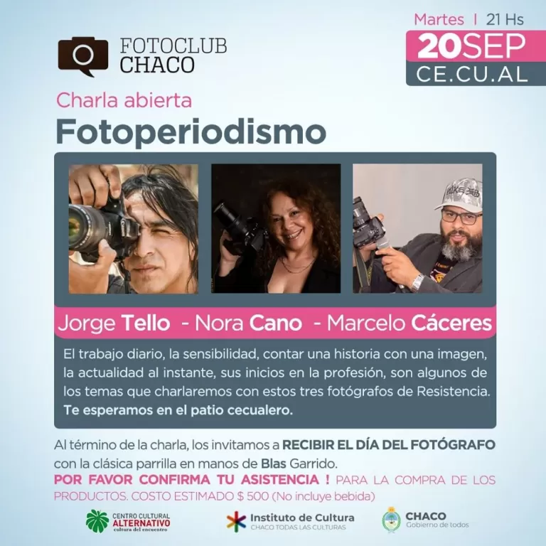 Este martes 20, a las 21, en el Centro Cultural Alternativo se realizará la charla abierta “Fotoperiodismo”, con las y los fotógrafos Jorge Tello, Nora Cano y Marcelo Cáceres. La actividad está organizada por el Fotoclub Chaco como parte de las celebraciones por el Día del Fotógrafo. La participación es libre y gratuita.